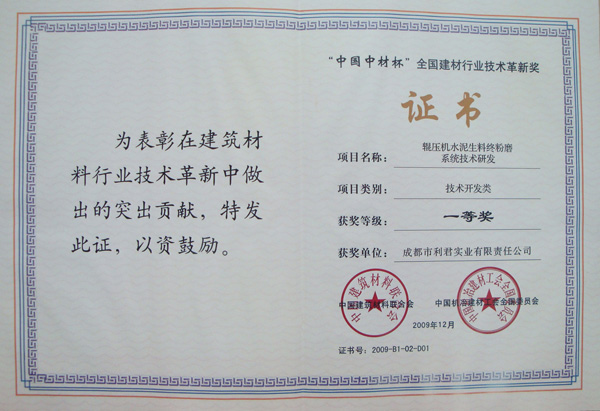 由“中國建筑材料聯(lián)合會”和“中國機(jī)冶建材全國委員會”舉辦的“中國中材杯”全國建材行業(yè)技術(shù)革新獎評比中,我公司“輥壓機(jī)水泥生料終粉磨系統(tǒng)技術(shù)研發(fā)項目”榮獲一等獎。12月19日公司派代表前往人民大會堂參加頒獎儀式。