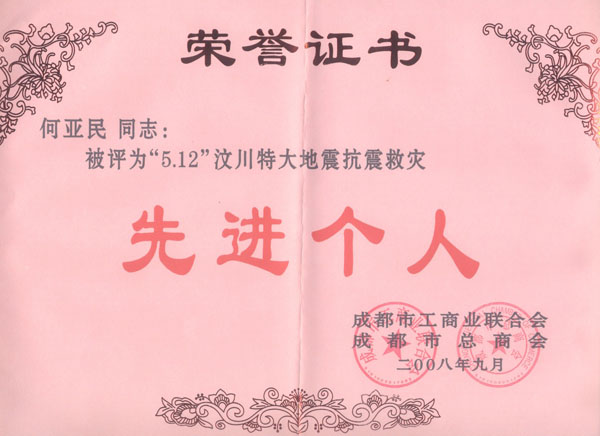 董事長何亞民被評為“5.12”汶川特大地震抗震救災(zāi)先進個人