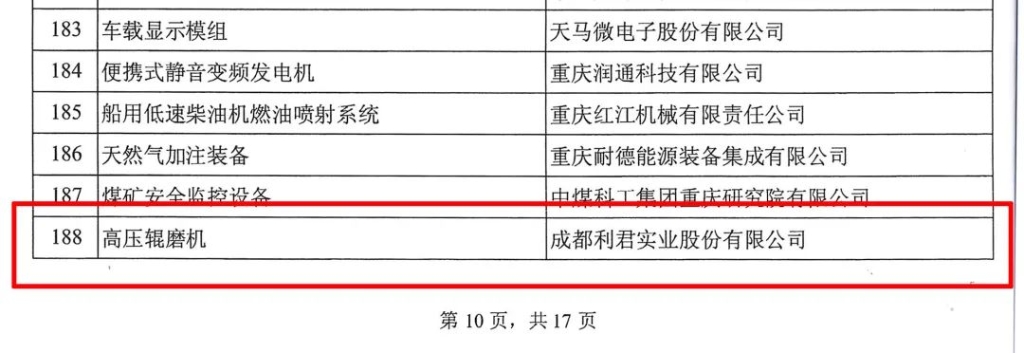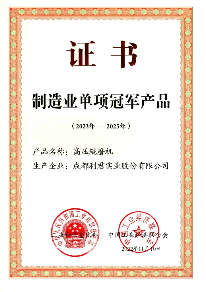 批、第四批制造業(yè)單項(xiàng)冠軍企業(yè)(產(chǎn)品)名單的通知》,成都利君實(shí)業(yè)股份有限公司(以下簡(jiǎn)稱“公司”)產(chǎn)品“高壓輥磨機(jī)”入選為第七批制造業(yè)單項(xiàng)冠軍產(chǎn)品
